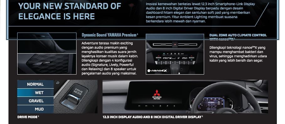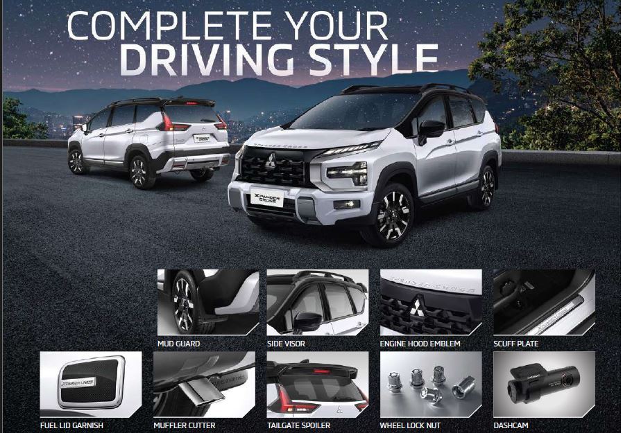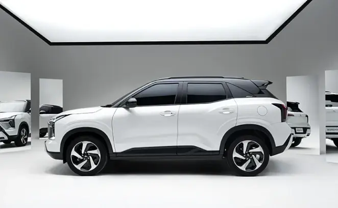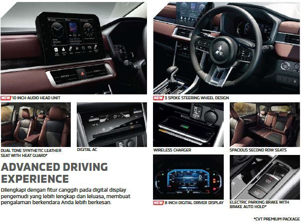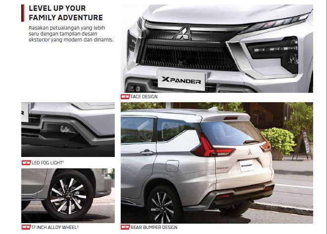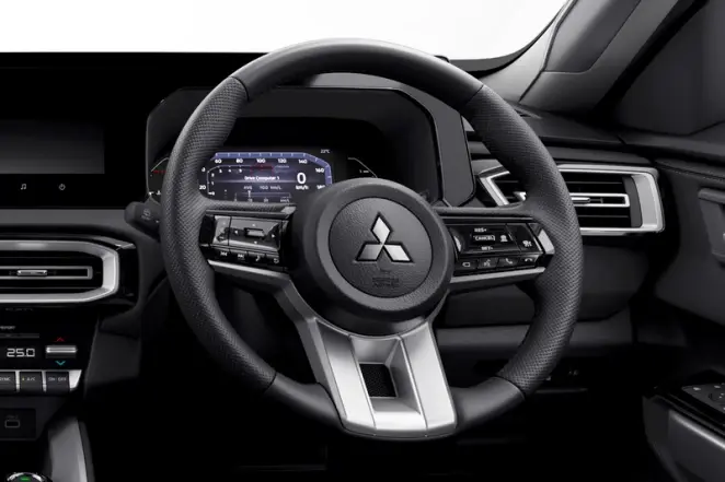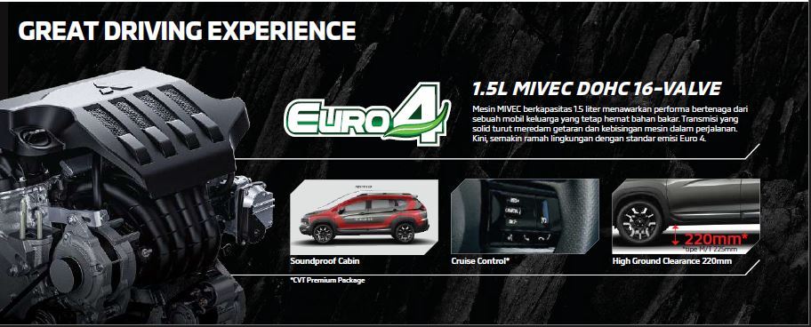 Desain eksterior kendaraan ini modern dan dinamis, dengan ground clearance tinggi yang memudahkan melewati berbagai kondisi jalan. Ditenagai mesin 1.5L MIVEC, kendaraan ini menawarkan tenaga optimal dan efisiensi bahan bakar, dipadukan dengan transmisi CVT untuk pengalaman berkendara yang halus.