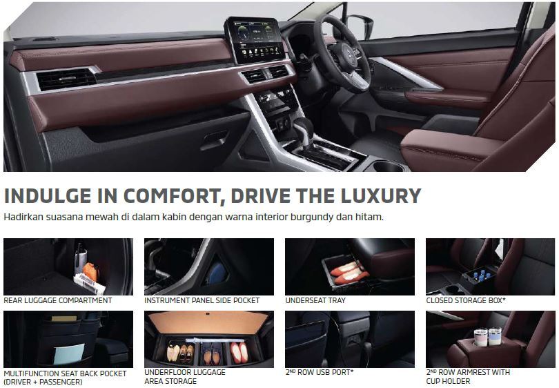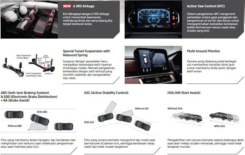 Kabin luas dan nyaman dapat menampung hingga 7 penumpang, dilengkapi ruang penyimpanan praktis dan sistem sirkulasi udara yang efisien. Fitur keselamatan lengkap, termasuk Dual SRS Airbags, ABS dengan EBD, Hill Start Assist, dan Active Stability Control, memberikan perlindungan maksimal saat berkendara.